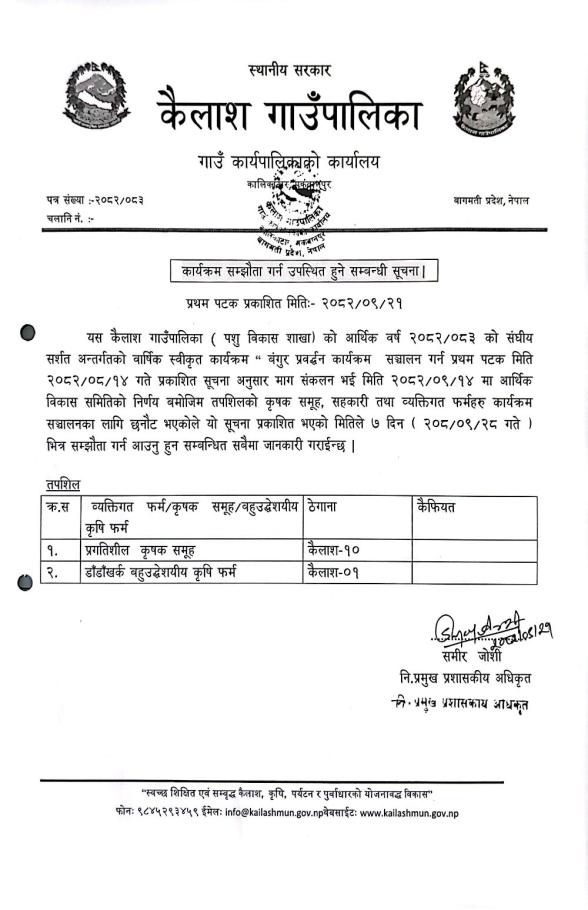 » बंगुर प्रवर्द्धन कार्यक्रमको सम्झौता गर्न उपस्थित हुने सम्बन्धी सूचना ।