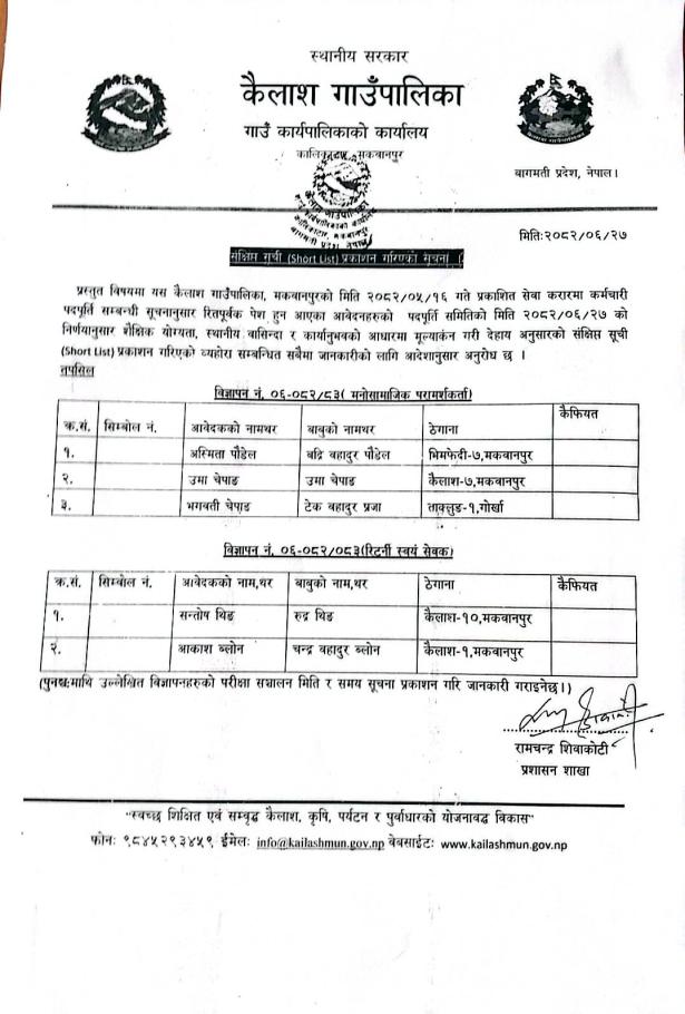 मनोसामाजिक परामर्शकर्ता र रिटर्नी स्यंम सेवकपदको संक्षिप्त सूचि प्रकाशन |