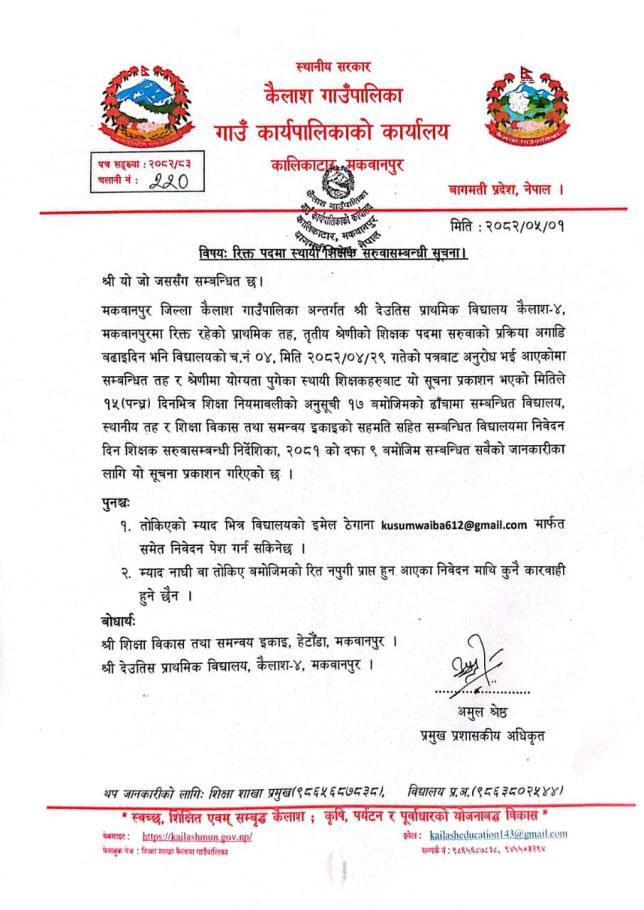 श्री आधारभुत बिद्यालय, कैलाश -२ मा शिक्षक आवश्यक्ताको सूचना !!!!