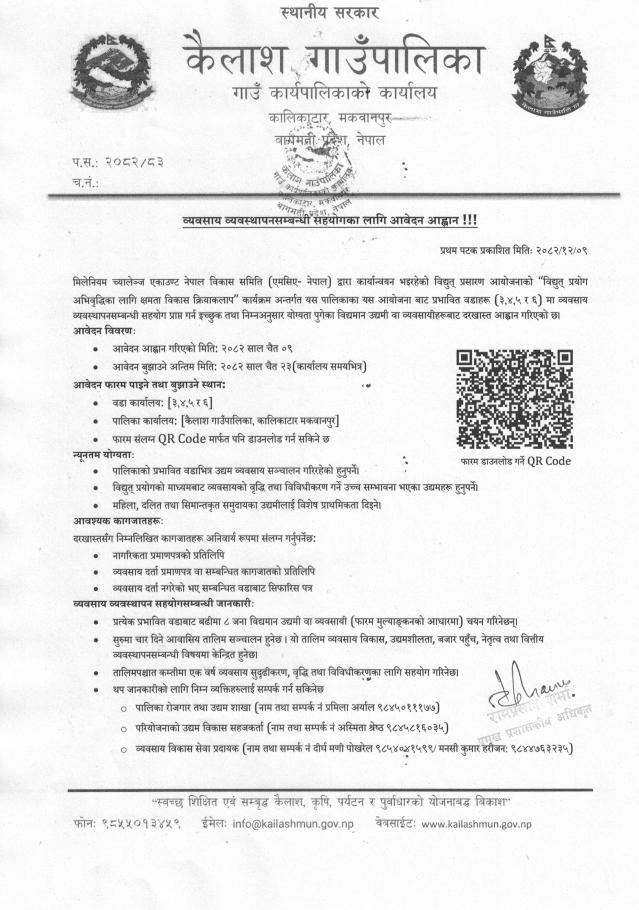 व्यवसाय व्यवस्थापन सम्बन्धी सहयोगका लागि आवेदन आव्हान ! ! !