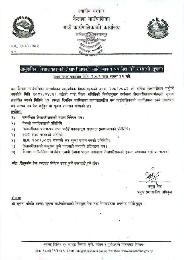 सामुदायिक विद्यालयहरूको लेखापरिक्षणको लागि आशय पत्र पेश गर्ने सम्बन्धी सूचना ! !