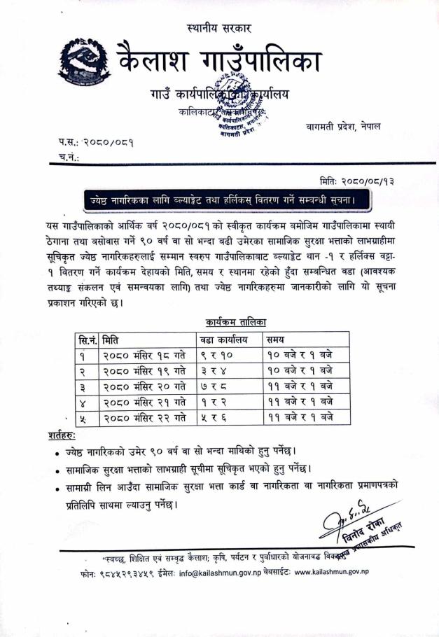 जेष्‍ठ नागरिकका लागि ब्ल्याङ्केट तथा हर्लिकस् वितरण गर्ने सम्बन्धी सूचना ! !
