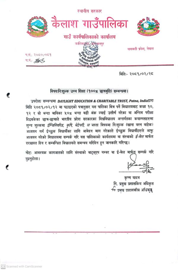 निःशुल्क उच्‍च शिक्षा (१००% छात्रवृति) सम्बन्धी सूचना ! !