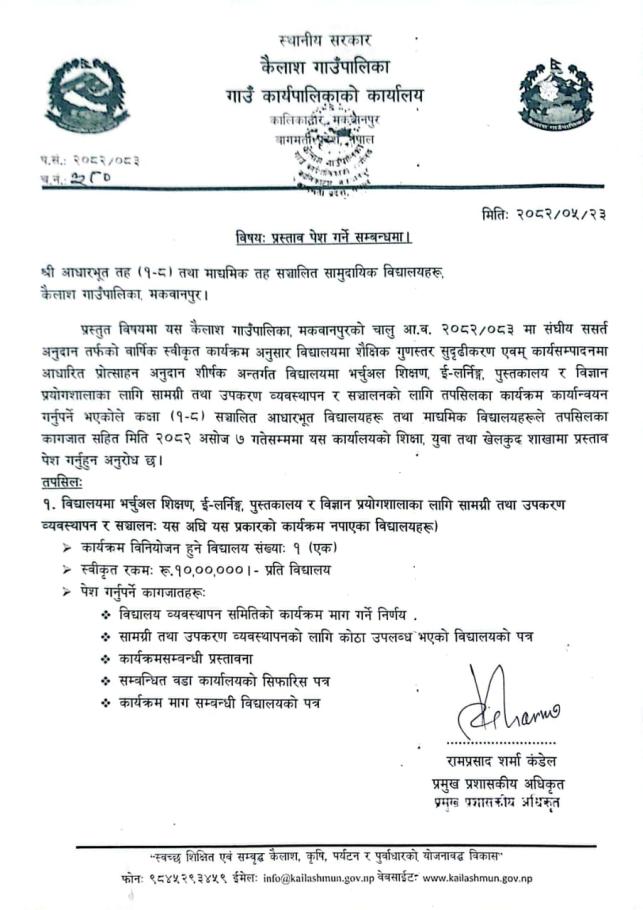 सामुदायिक बिधालयहरुलाई प्रस्ताव पेश गर्ने सूचना ।