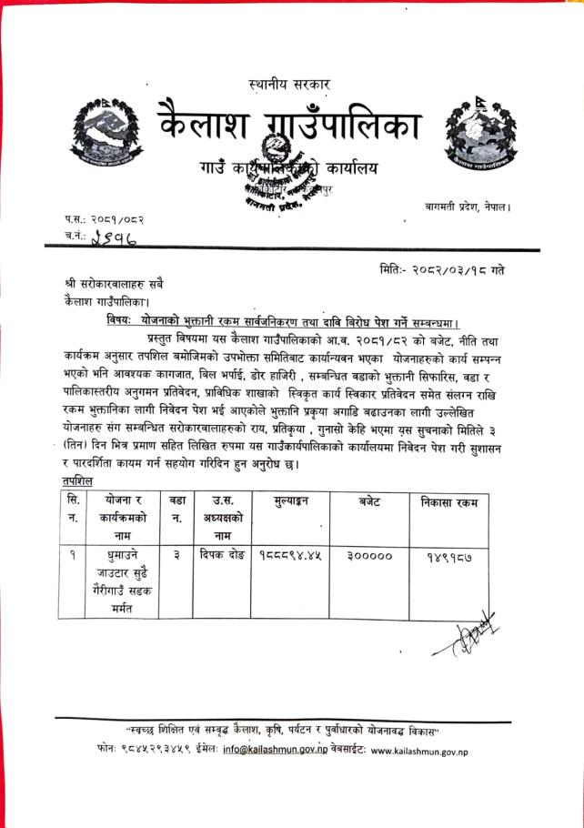 योजनाको भुक्तानी रकम सार्वजनिकरण तथा दावि बोरोध पेश गर्ने सम्बन्धमा।