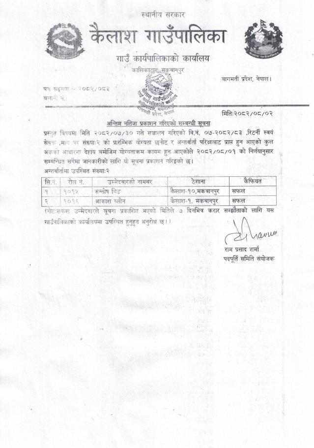 ल्याब असिष्टेन्ट र रिटर्नी स्वयं सेवकपदको अन्तिम नतिजा प्रकाशन गरिएको सूचना ! !