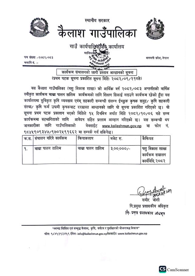 वाख्रा पालन तालिम कार्यक्रम संचालनको लागी प्रस्ताव आव्हानको सूचना ।