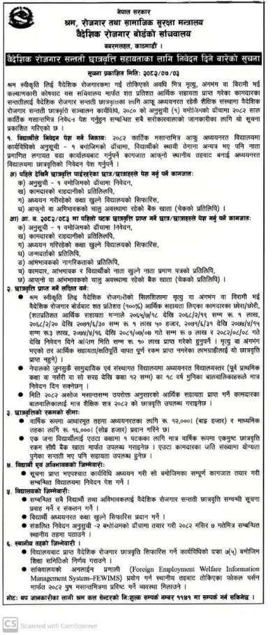 वैदेशिक रोजगार सन्तती छात्रवृति सहायताका लागि निवेदन दिने सम्बन्धी सूचना ! !