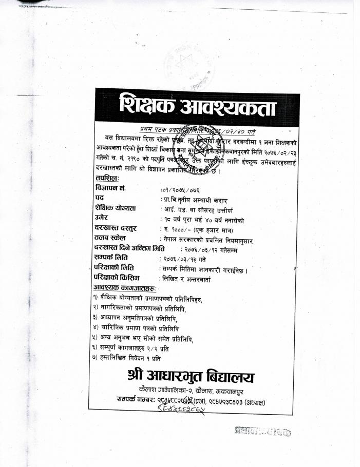श्री आधारभुत बिद्यालय, कैलाश -२ मा शिक्षक आवश्यक्ताको सूचना !!!!