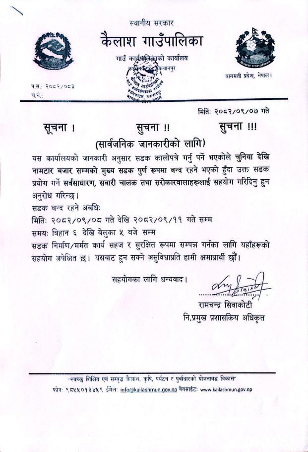 सडक बन्द रहने सम्बन्धी सूचना ।