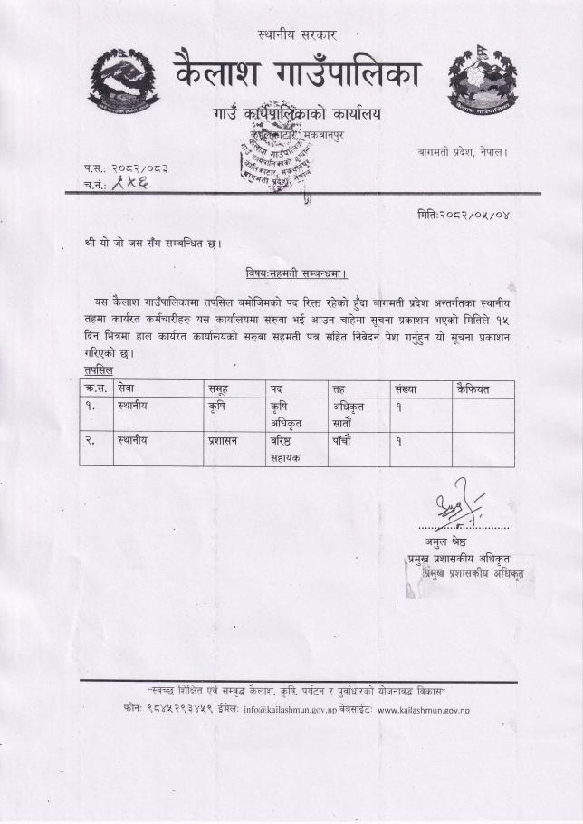 करार सेवाको लागि दरखास्त आव्हान गरिएको सूचना ! !