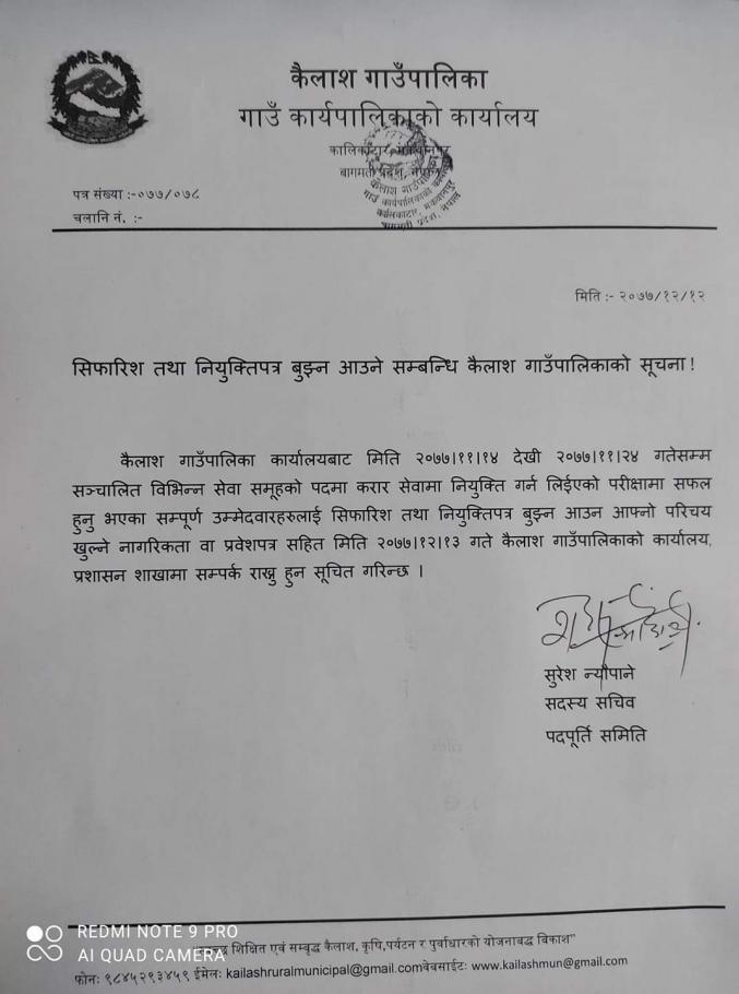 सिफारिश तथा नियुक्तिपत्र बुझ्न आउने सूचना !!