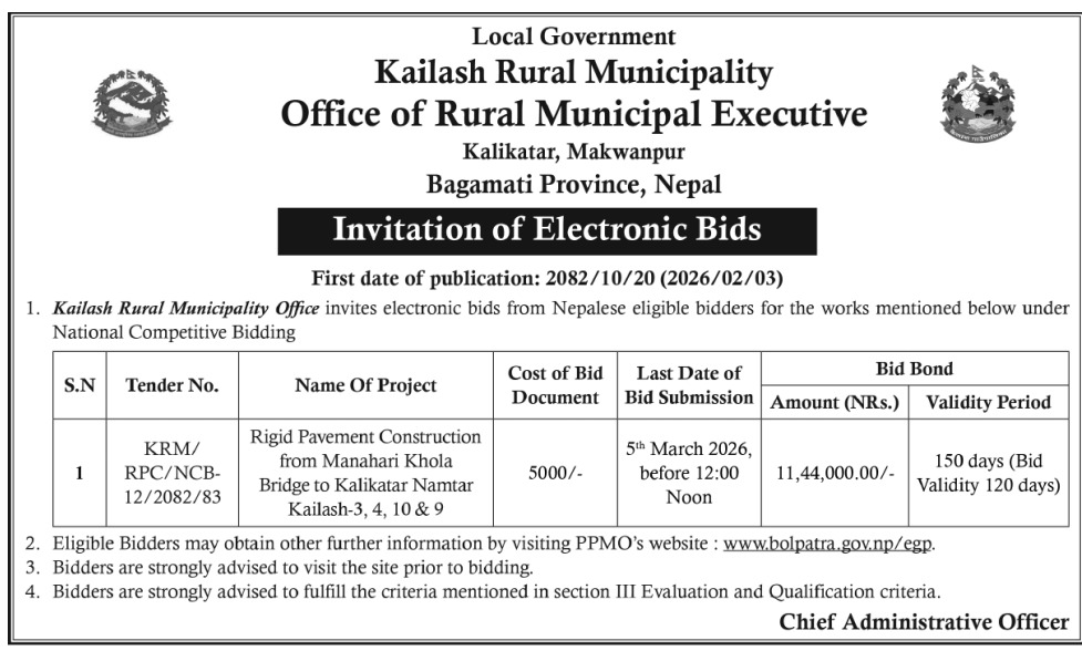 Invitation of Electronic Bids- Rigid Pavement Construction from Manahari Khola Bridge To Kalikatar Namtar Kailash 3,4,10 & 9